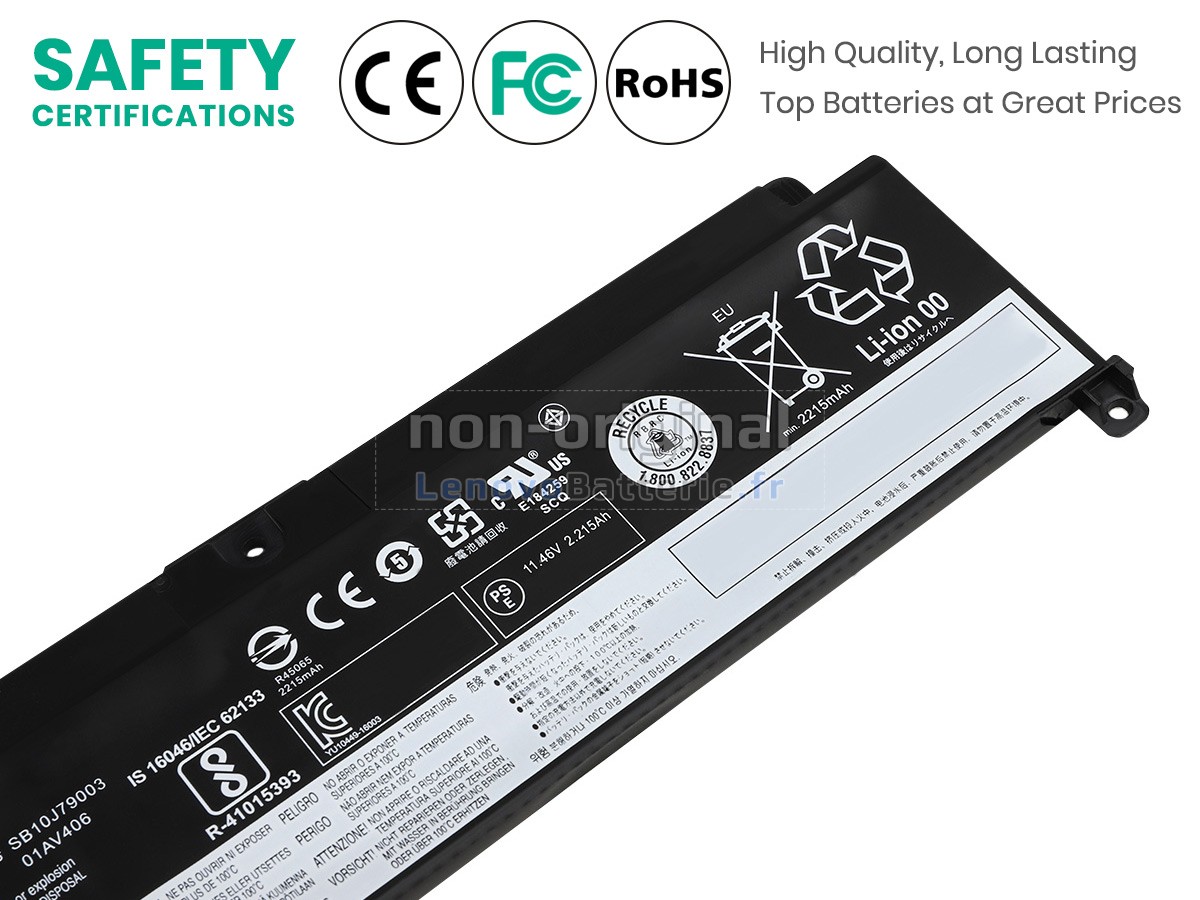 Toutes les batteries Lenovo 00HW038 sont certifiées par NF, CE et UL, et elles sont conformes aux normes françaises et européennes. De plus, elles sont contrôlées avec une série de tests rigoureux avant la sortie d'usine, pour garantir votre sécurité !