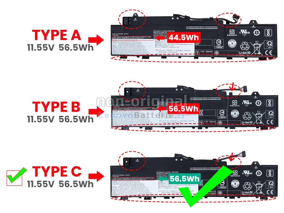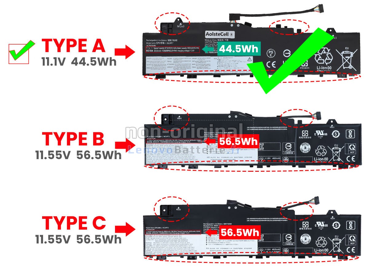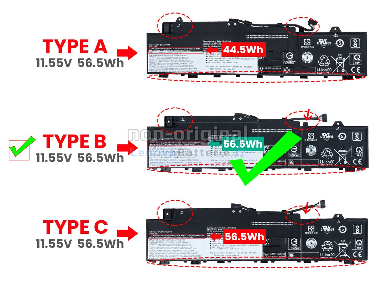 2Comparez la tension et la capacité de votre batterie avec notre batterie IdeaPad 5 14ITL05-82FE00XLPB, et vérifiez que le connecteur et la forme de la batterie sont identiques à ceux illustrés sur notre site web.