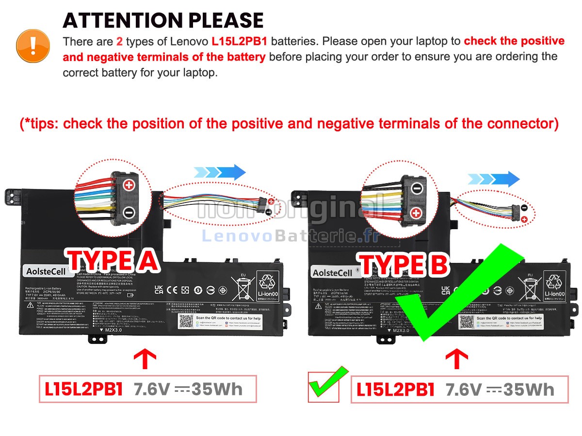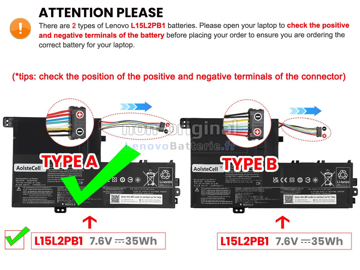 2Comparez la tension et la capacité de votre batterie avec notre batterie L15L2PB1, et vérifiez que le connecteur et la forme de la batterie sont identiques à ceux illustrés sur notre site web.