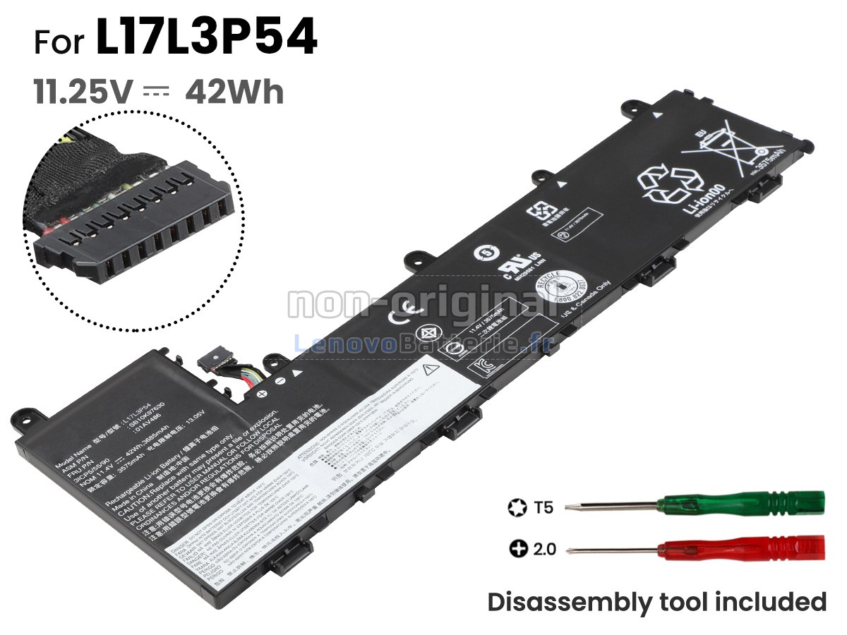 Toutes les batteries Lenovo L17L3P54 sont certifiées par NF, CE et UL, et elles sont conformes aux normes françaises et européennes. De plus, elles sont contrôlées avec une série de tests rigoureux avant la sortie d'usine, pour garantir votre sécurité !