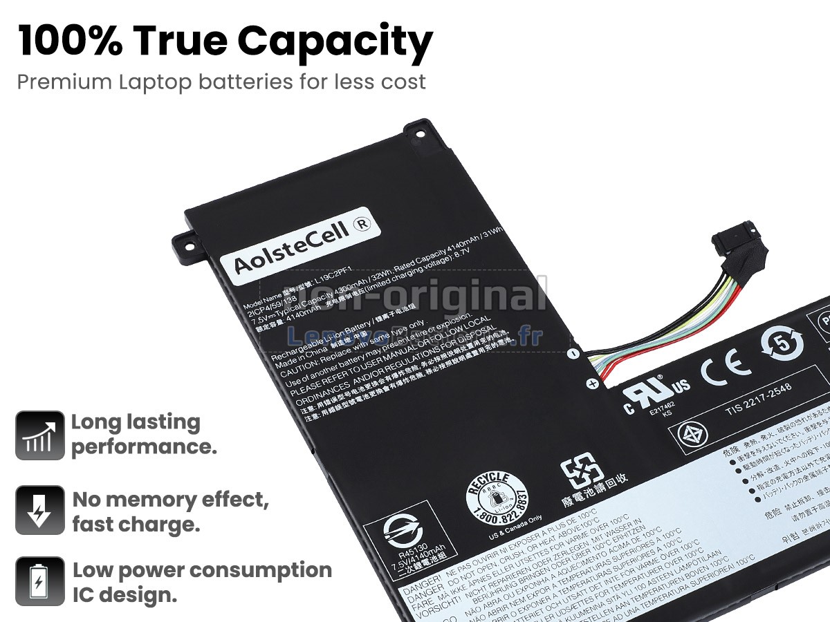Toutes les batteries Lenovo L19L2PF1 sont certifiées par NF, CE et UL, et elles sont conformes aux normes françaises et européennes. De plus, elles sont contrôlées avec une série de tests rigoureux avant la sortie d'usine, pour garantir votre sécurité !