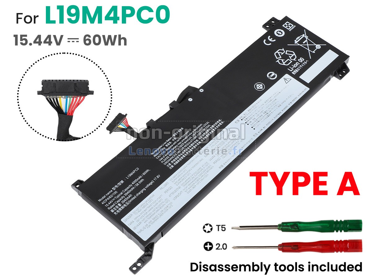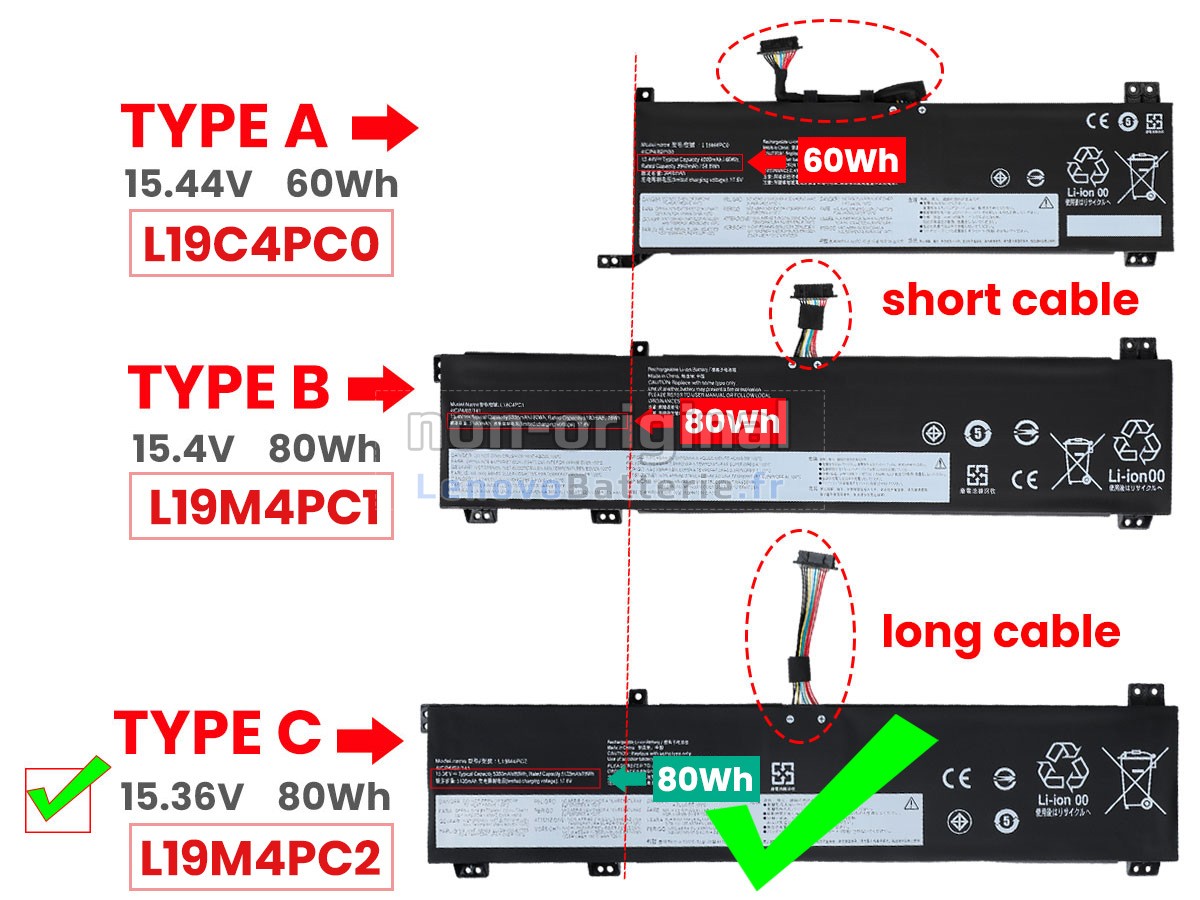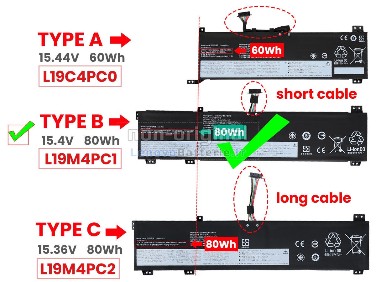2Comparez la tension et la capacité de votre batterie avec notre batterie LEGION 5P 15ARH05H-82GU000BAD, et vérifiez que le connecteur et la forme de la batterie sont identiques à ceux illustrés sur notre site web.