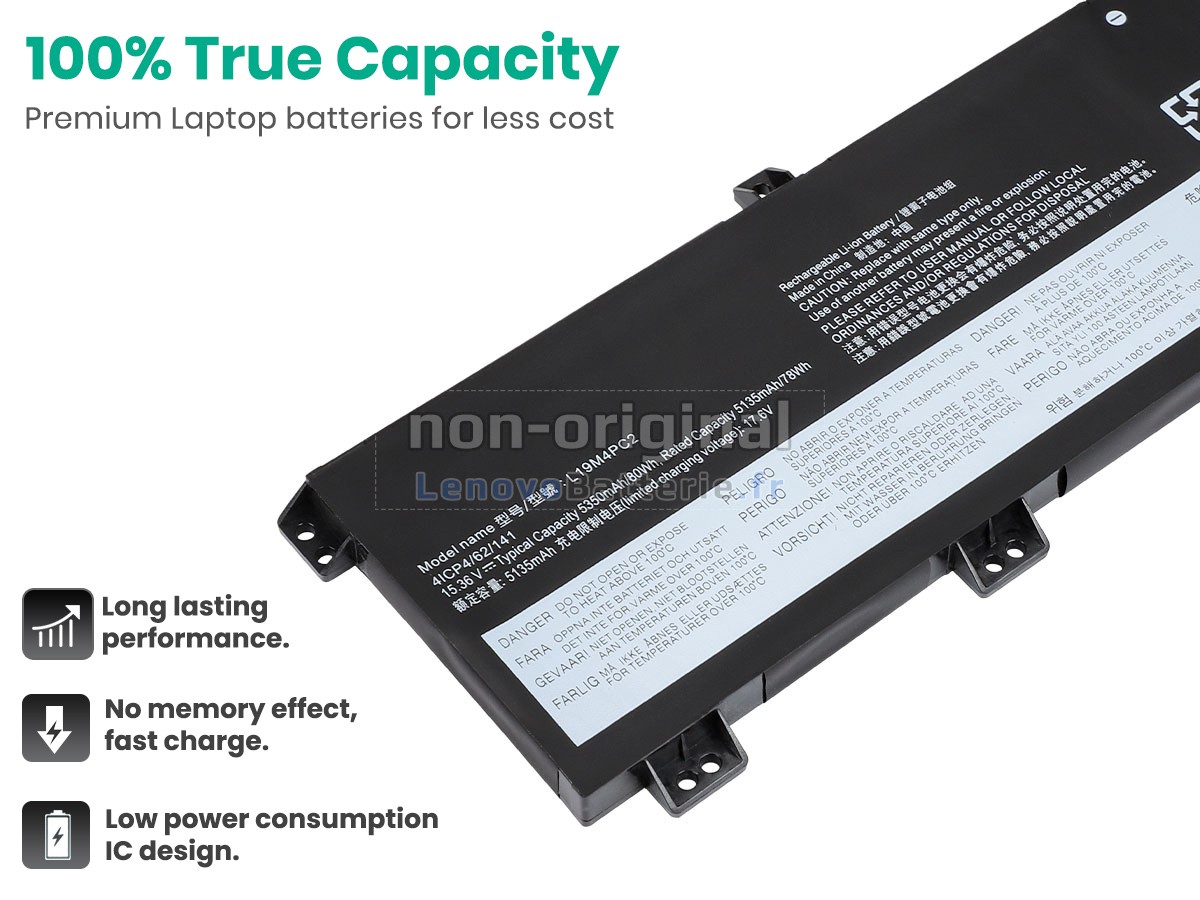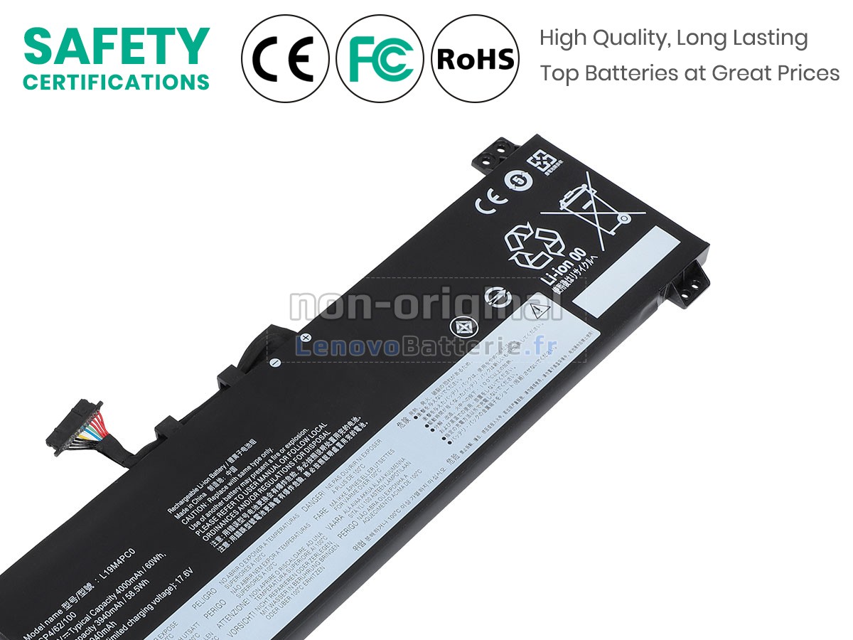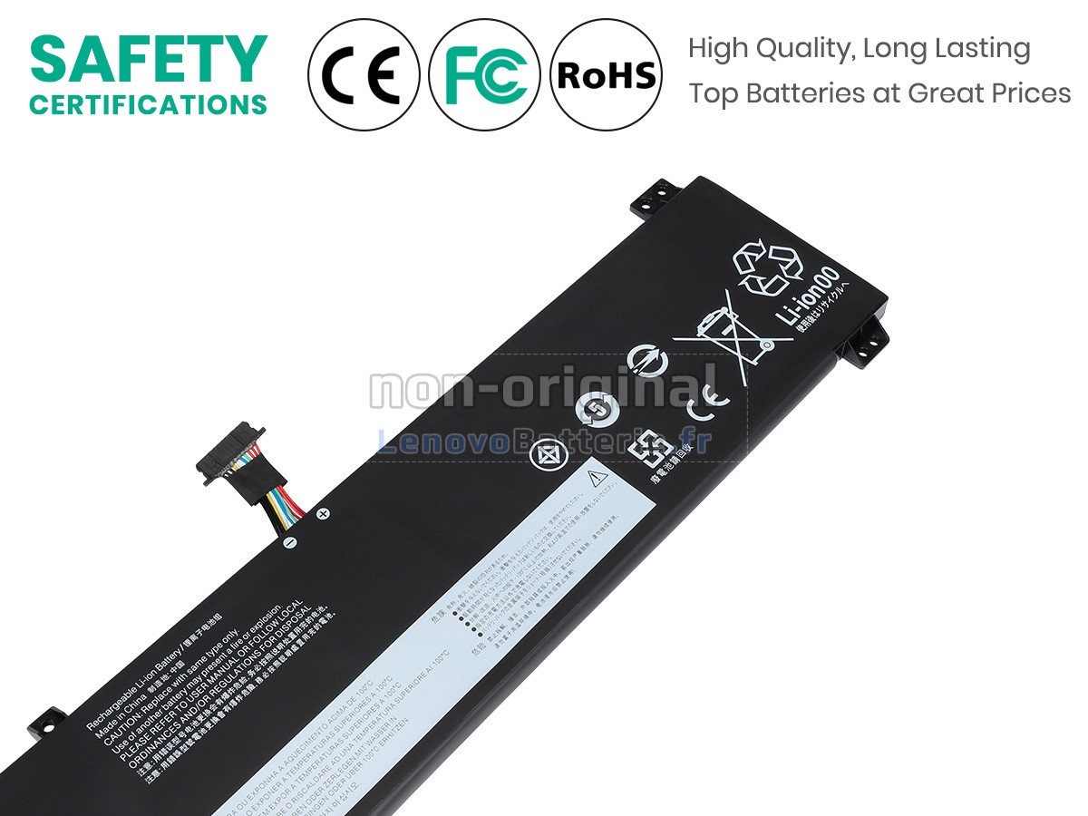 Toutes les batteries vendues sur LenovoBatterie.fr sont de nouvelles batteries de rechange, au lieu des batteries originales. En fait, nous utilisons les cellules et les puces intelligentes d'origine de la grande marque pour fabriquer les batteries de rechange, qui ont presque les mêmes performances, voire meilleures que les batteries d'origine. Comme ça, les primes de la marque seront supprimées mais sans compromettre la qualité. En outre, les batteries Lenovo LEGION 5P 15ARH05H-82GU000BAD d'origine sont faites de différents accessoires de tiers, uniquement avec un logo de marque. Sur LenovoBatterie.fr, vous pouvez obtenir des batteries avec meilleur rapport qualité-prix !