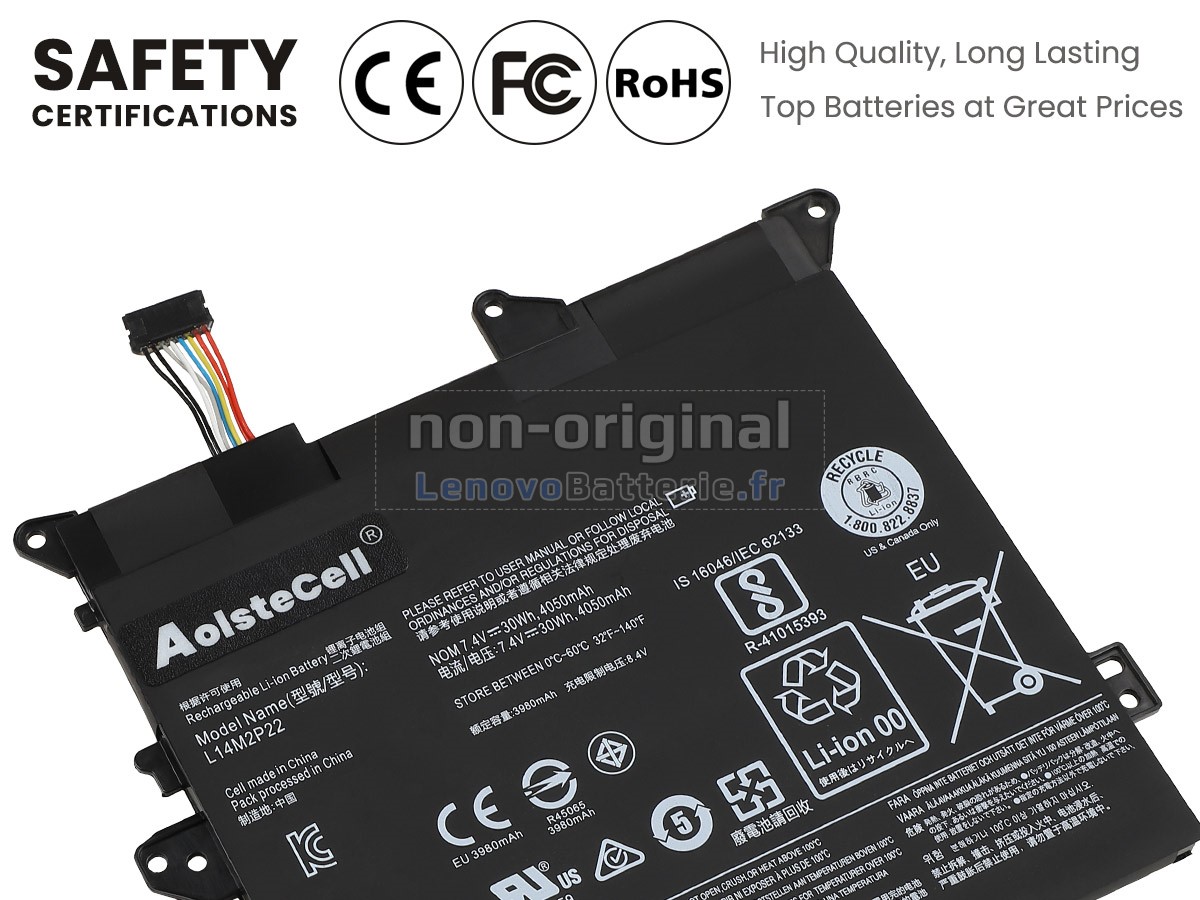 Toutes les batteries Lenovo YOGA 300-11IBY-80M0005WGE sont certifiées par NF, CE et UL, et elles sont conformes aux normes françaises et européennes. De plus, elles sont contrôlées avec une série de tests rigoureux avant la sortie d'usine, pour garantir votre sécurité !